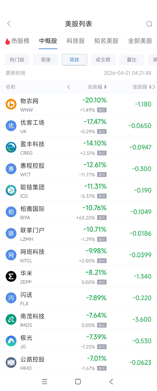 4月21日热门中概股涨跌不一,中国金龙指数(HXC)收跌0.32%。