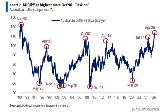 与此形成对比的是,XLF跌破200日均线,金融板块的疲软暗示此轮上涨缺乏足够市场广度。澳元兑日元同期升至1990年10月以来最高水平,Hartnett将其视为风险偏好极度高涨的缩影,同时也将这一“周期性货币对避险货币”的极端强势列为市场过热的参考指标之一。